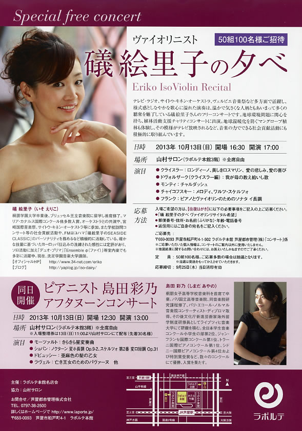 全席自由(往復はがきで芦屋市船戸町4-1-502 ラポルテ本館芦屋都市管理(株)「コンサート係」応募) |