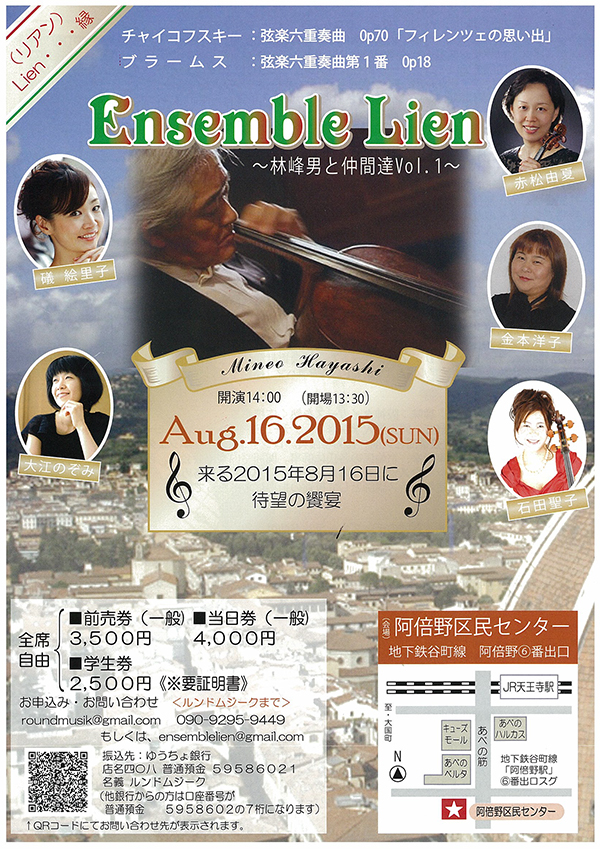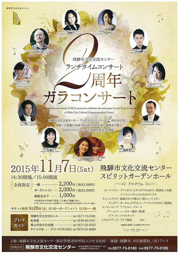 礒絵里子Vl. 大西秀明Vl. エマニュエル・ジラールVc. 田村緑Pf. デュエットゥPf. 浜まゆみMrb. 本多啓佑Ob.他 |